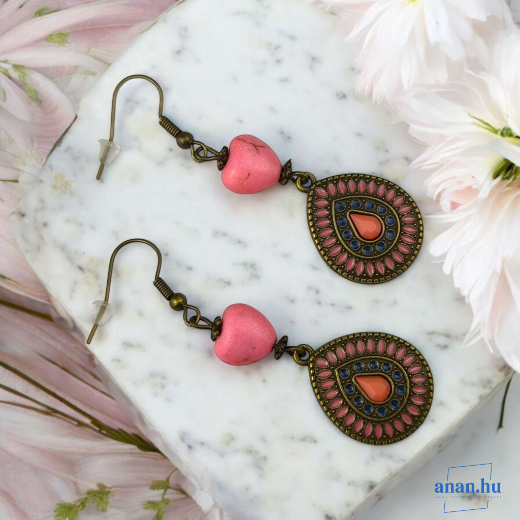 Bronzszínű, pink rekeszzománccal díszített fülbevaló, pink kőgyönggyel, bronzszínű szerelékekkel és akasztóval.