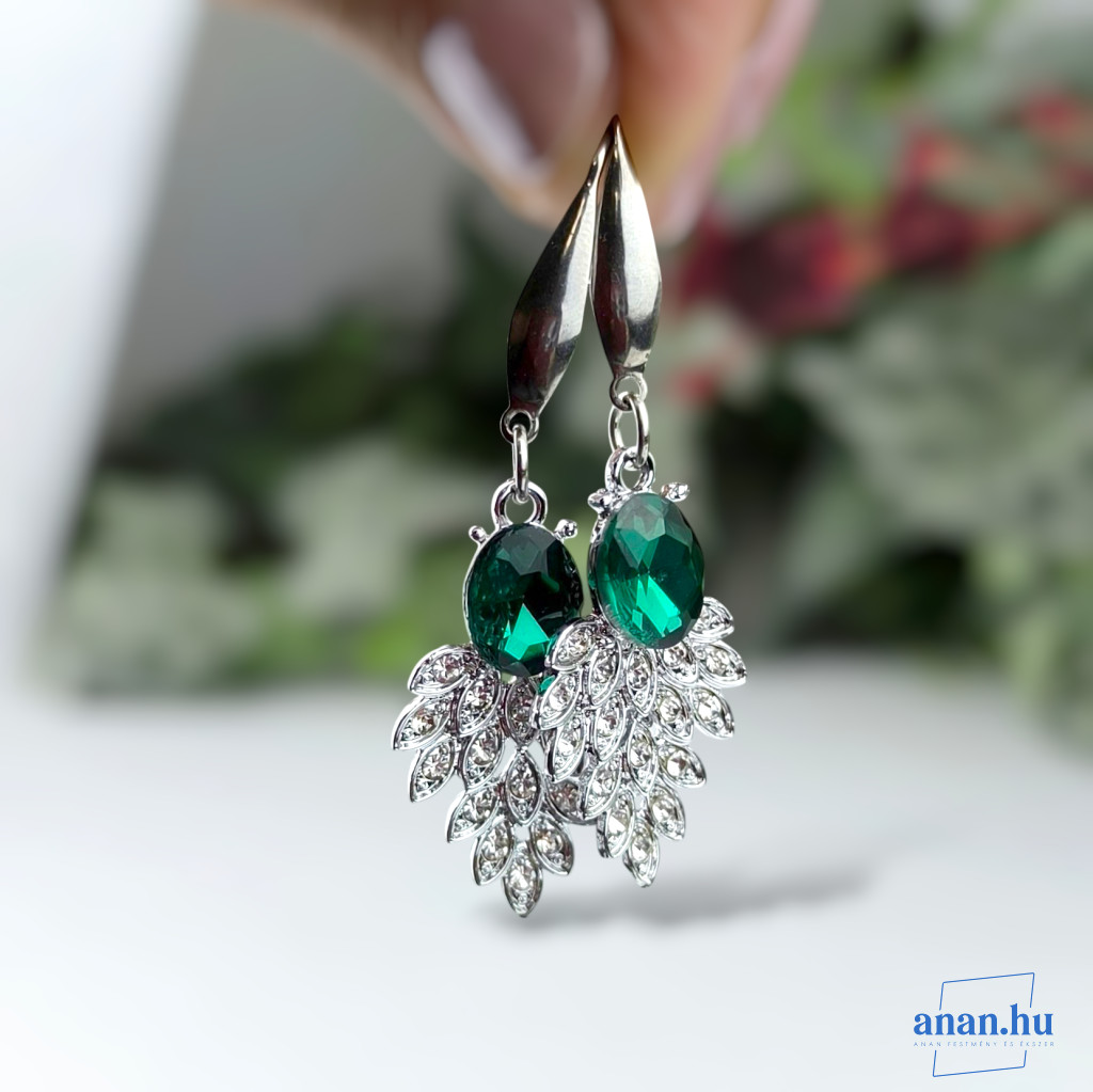 Csiszolt zöld színű üvegkristállyal és strasszokkal díszített cink ötvözet fülbevaló antiallergén nemesacél fülbevaló akasztóval.