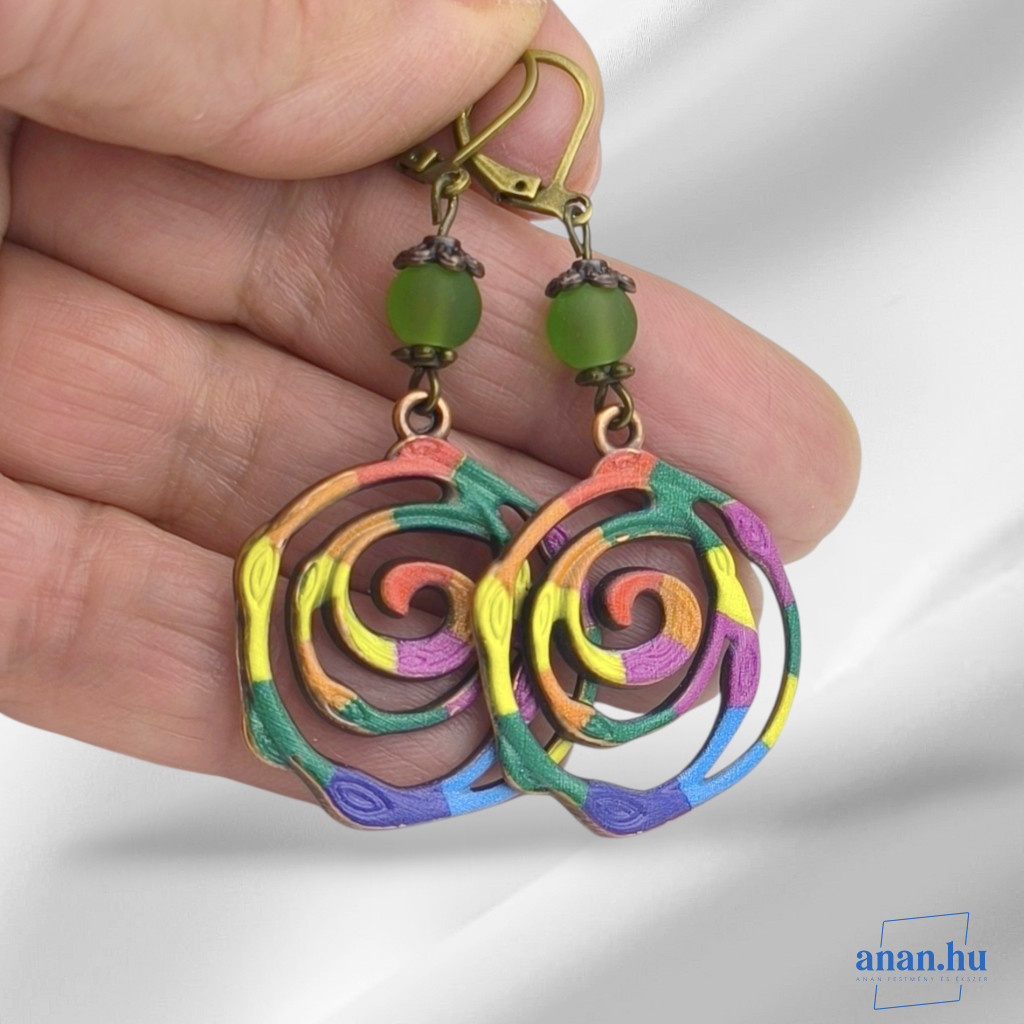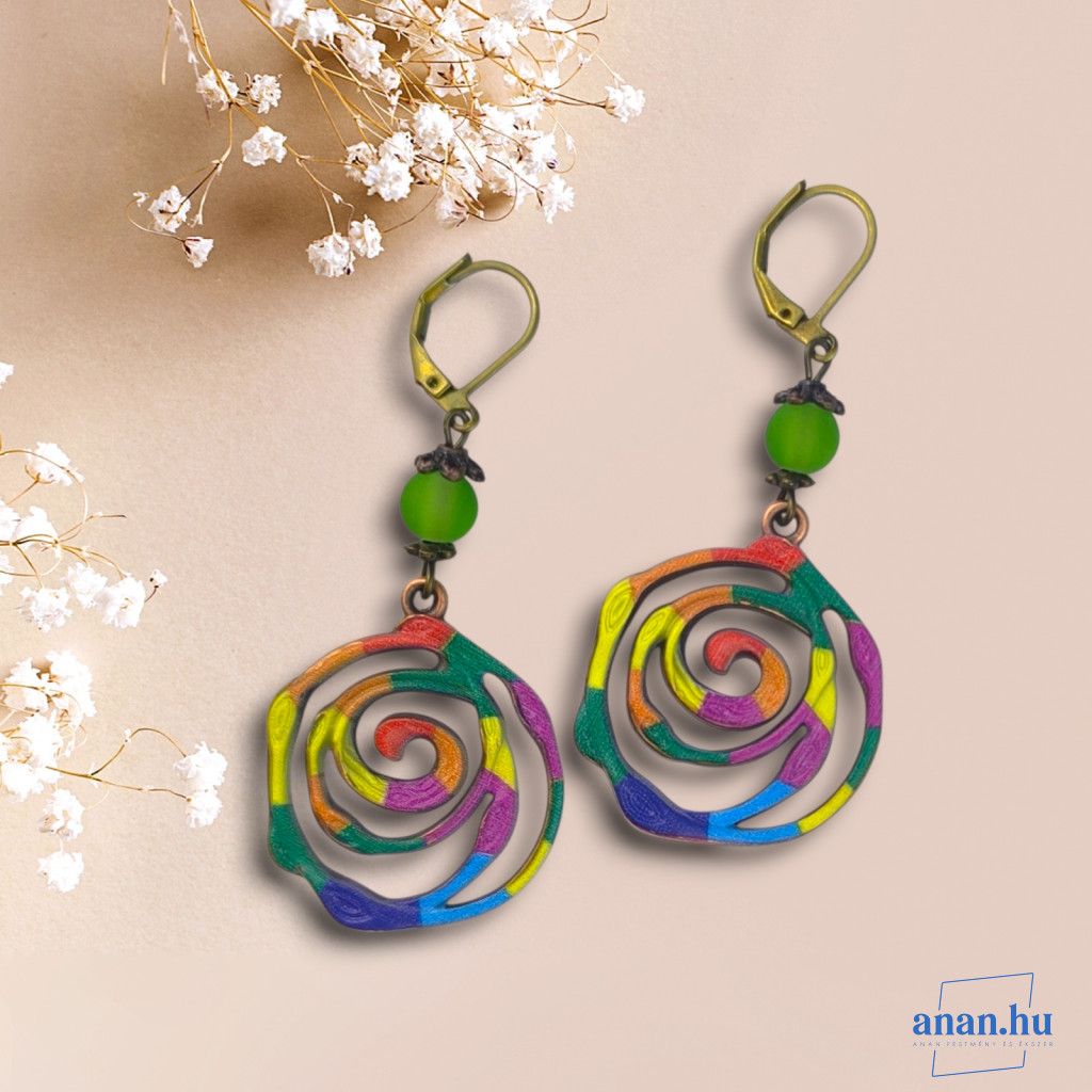 Színes rekeszzománccal díszített, spirális mintájú cink ötvözet fülbevaló, üveg gyönggyel és bronz színű francia kapoccsal.