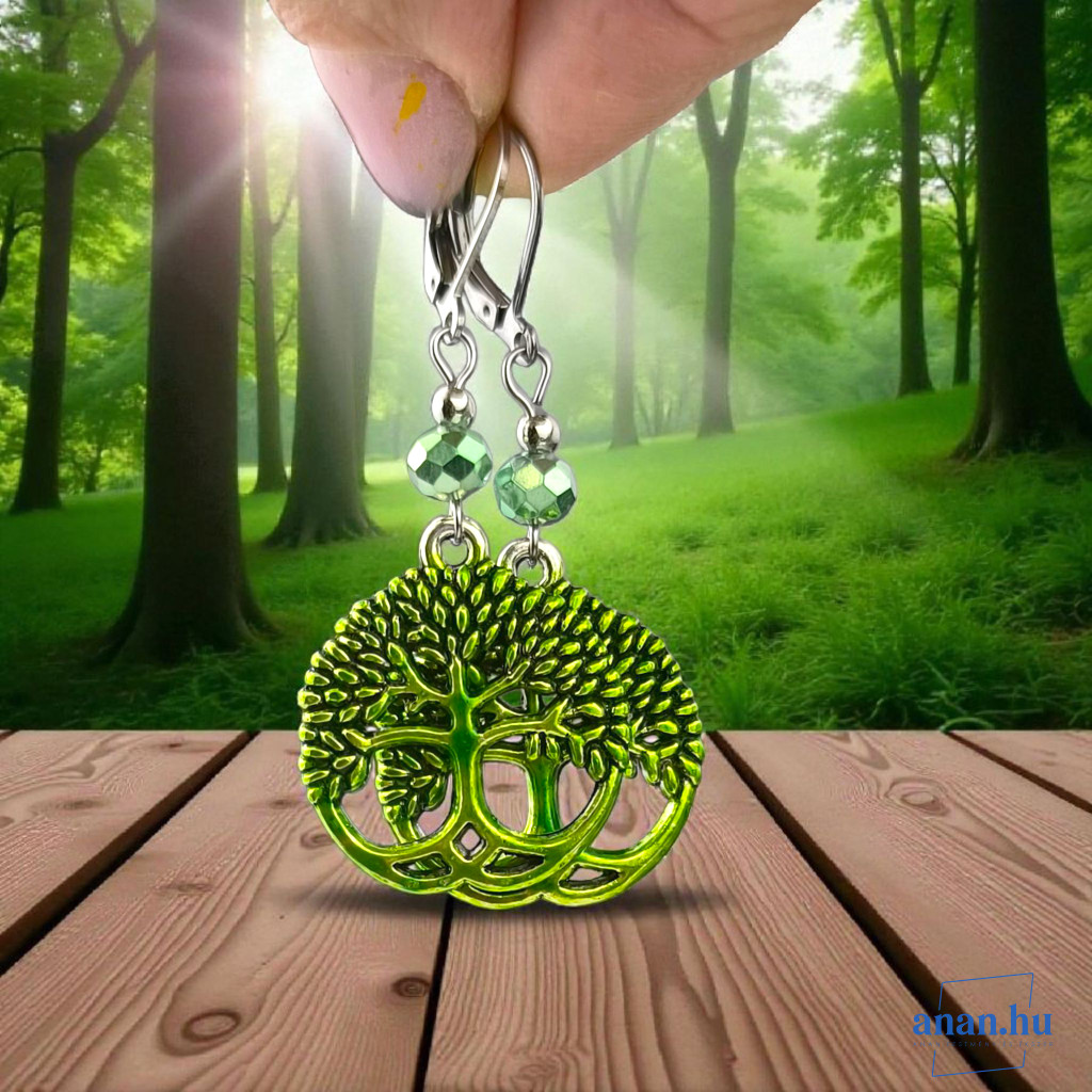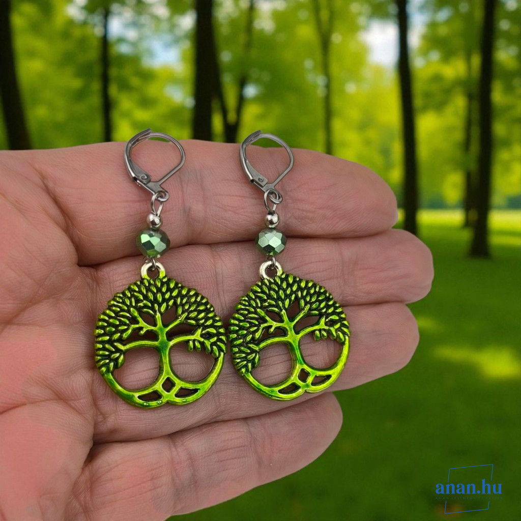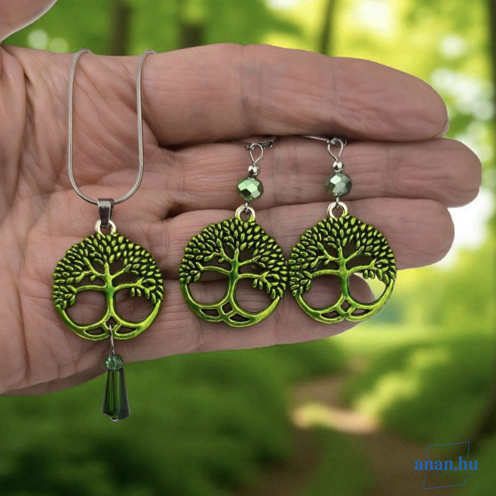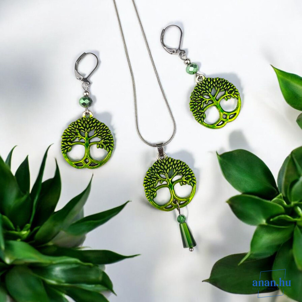 ANAN, kézzel festett, egyedi ékszer, fülbevaló, nyaklánc, aranyzöld, Életfa
