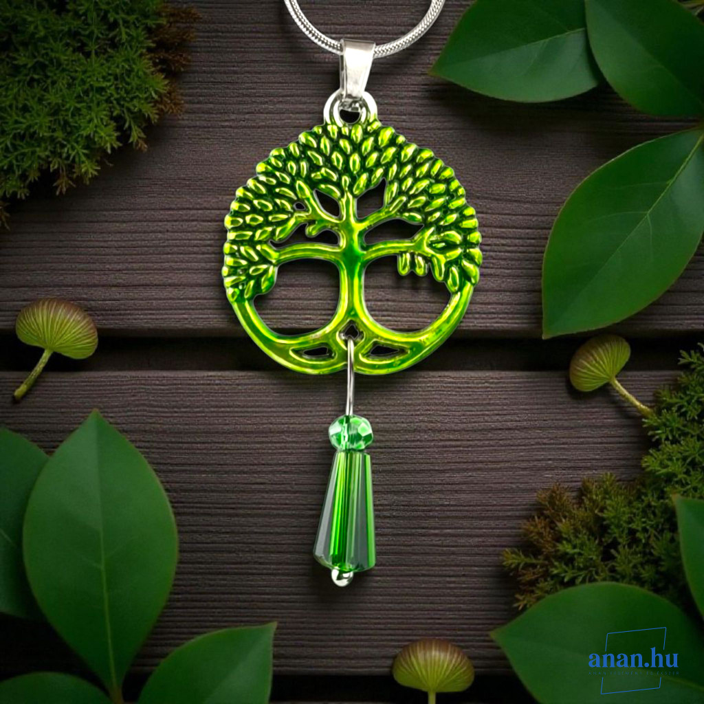 Életfa medál zöld üveg cseppel 45 cm hosszú antiallergén nemesacél kígyóláncon.