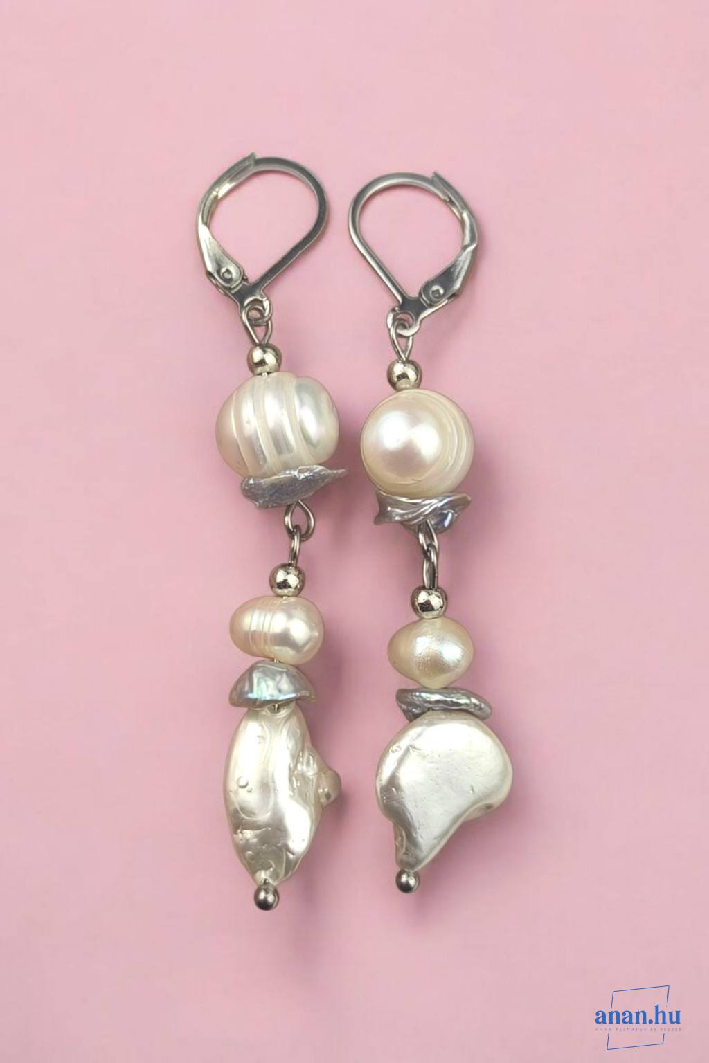 Antiallergén nemesacél francia kapcsos, aszimmetrikus fülbevaló fehér színű, különleges formájú mesterséges kagylógyönggyel, édesvízi gyöngyökkel.