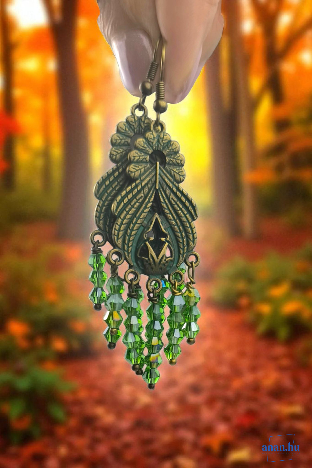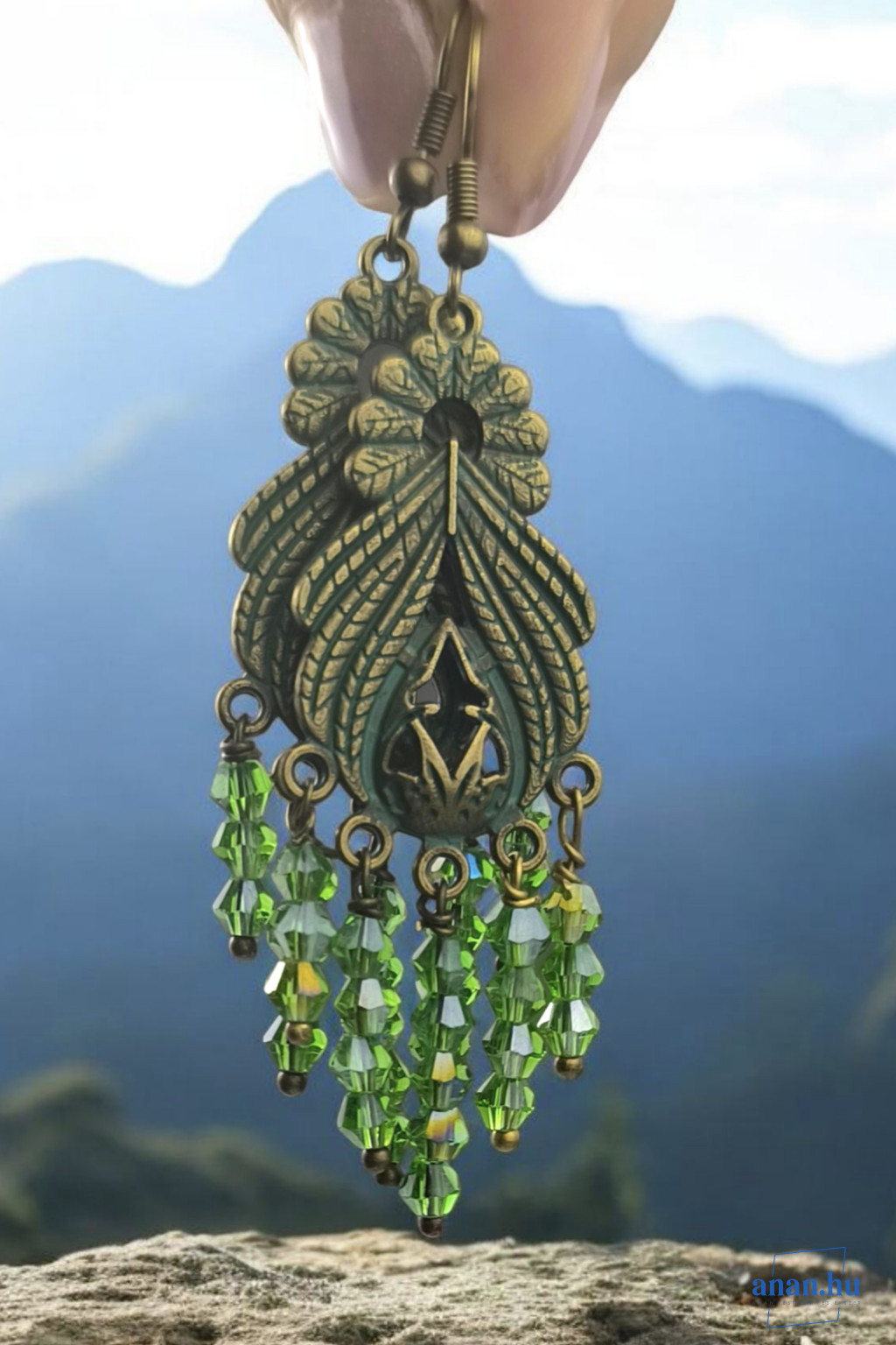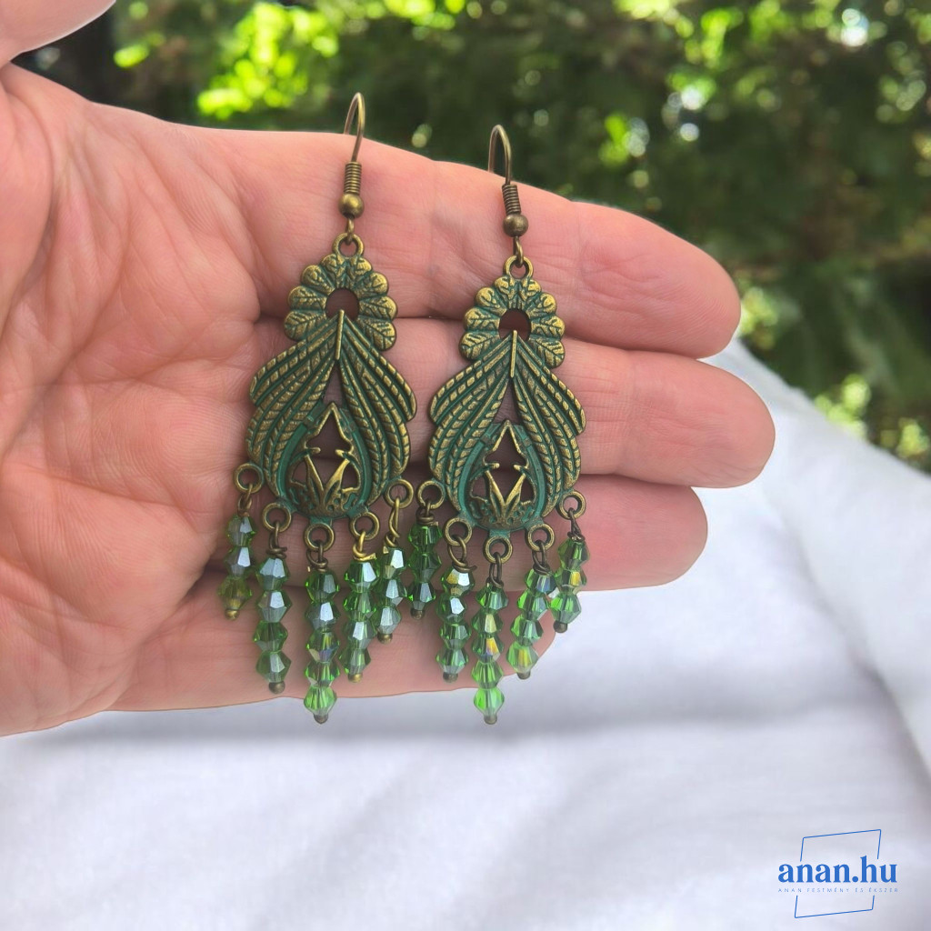 Bronzszínű, antikolt cinkötvözet fülbevaló, zöld csiszolt kristály gyöngyökkel bronz akasztóval.