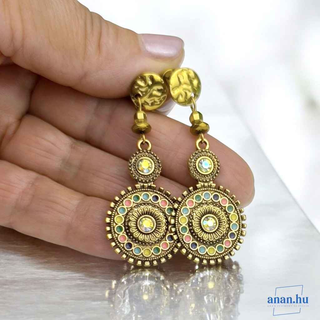 Óarany színű, színes rekeszzománccal és strasszokkal, kristály és hematit gyönggyel.
