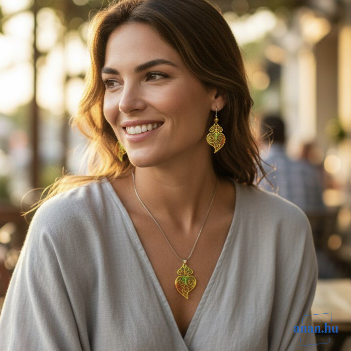 Minden ékszer egyedi darab, ezért minimális mértékben eltérhet a fotón láthatótól.Kézzel festett ékszereink esetében az alkalmi használat ajánlott, ne menjünk vele uszodába, gyógyvizes fürdőbe, mert az ékszer festett felülete, színe és ragyogása sérülhet. Dörzsöléstől, karcolástól óvjuk. Tisztítására nedves, puha ruhával történő áttörlést javasoljuk. Oldószerek használata tilos.