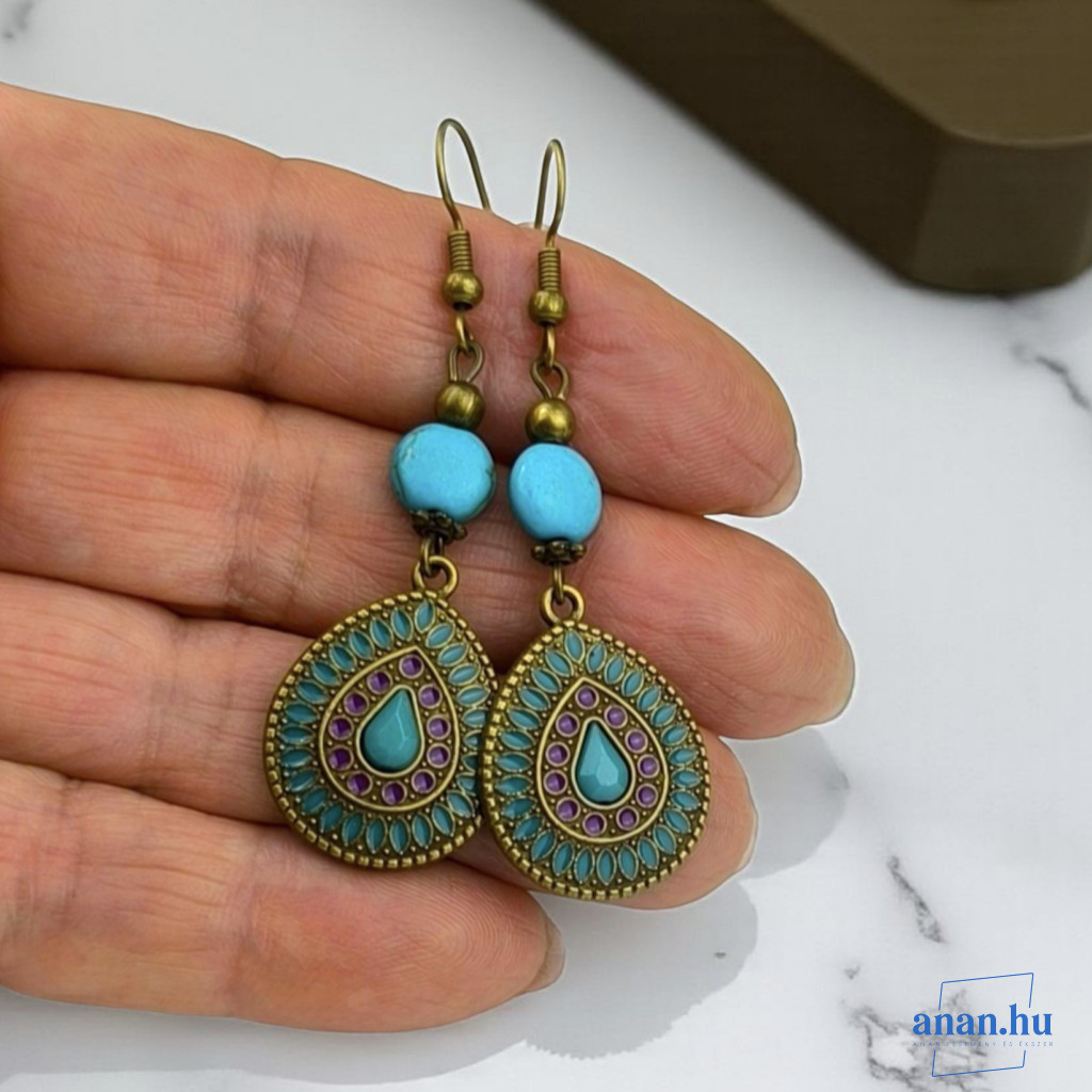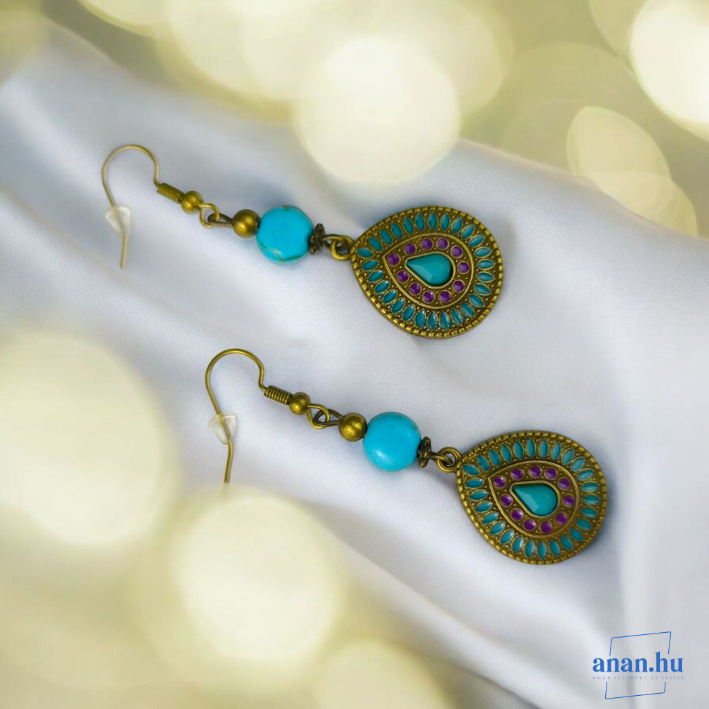 Bronzszínű, kék rekeszzománccal díszített fülbevaló, kék kőgyönggyel, bronzszínű szerelékekkel és akasztóval.