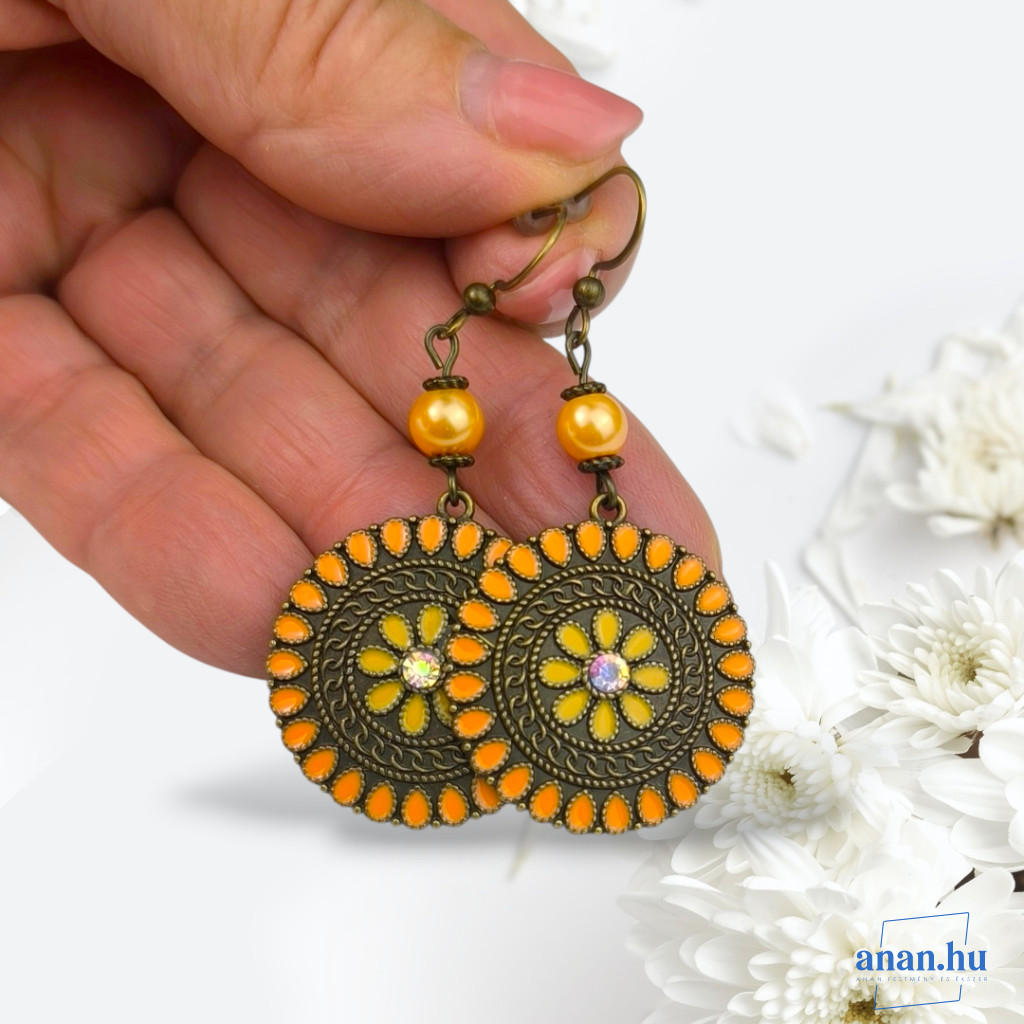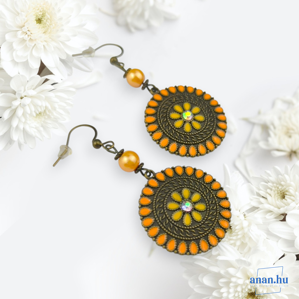 Bronz színű, sárga-narancs színű rekeszzománccal és strassz kővel díszített fülbevaló szintetikus kagylógyönggyel, bronz színű akasztóval.