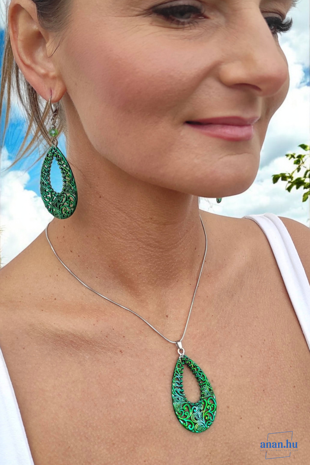 ANAN, kézzel festett, egyedi ékszer, fülbevaló, nyaklánc, Smaragd Csipke
