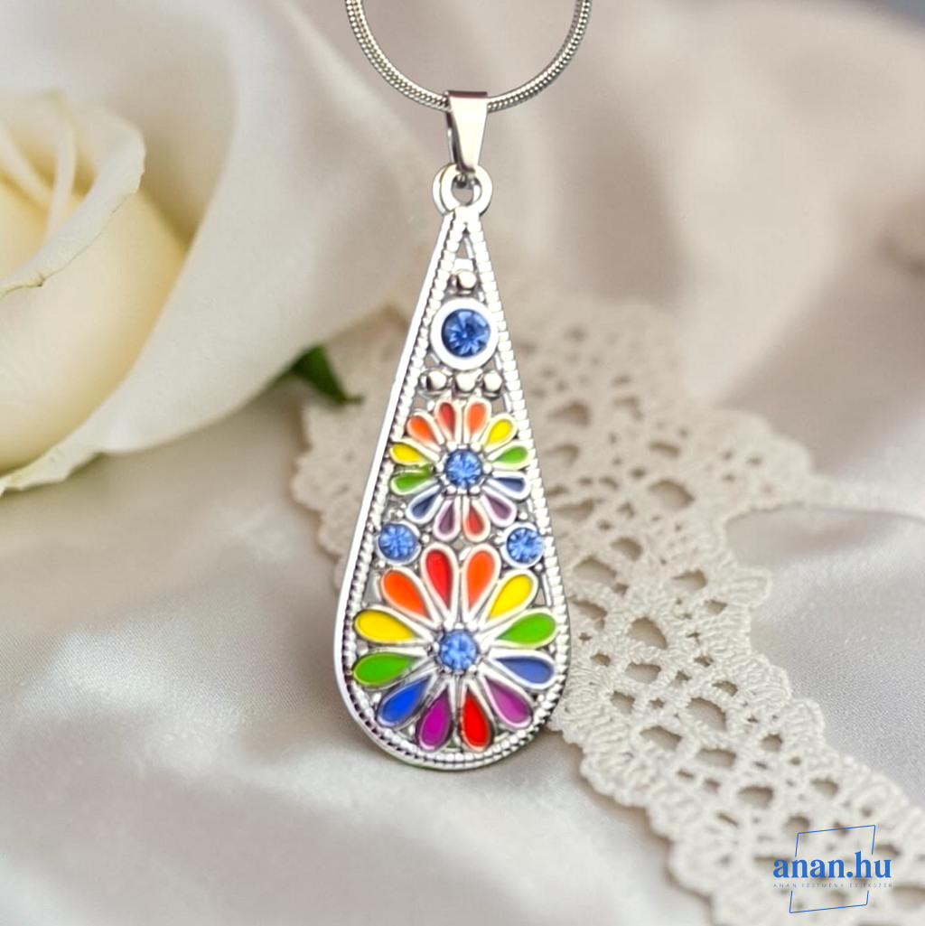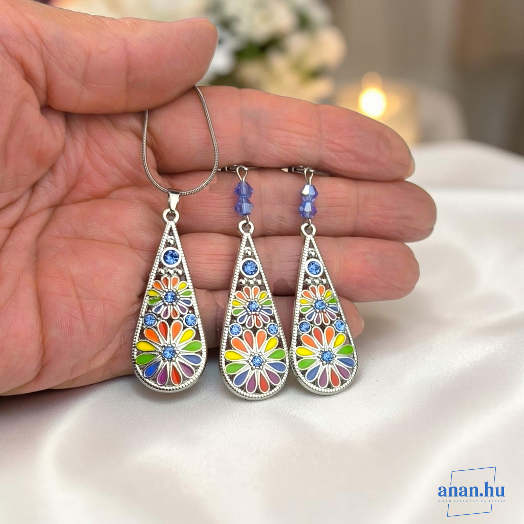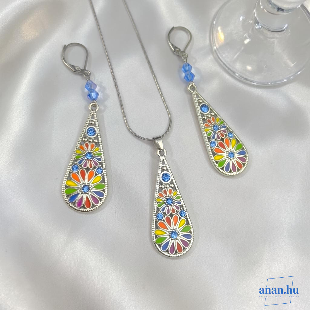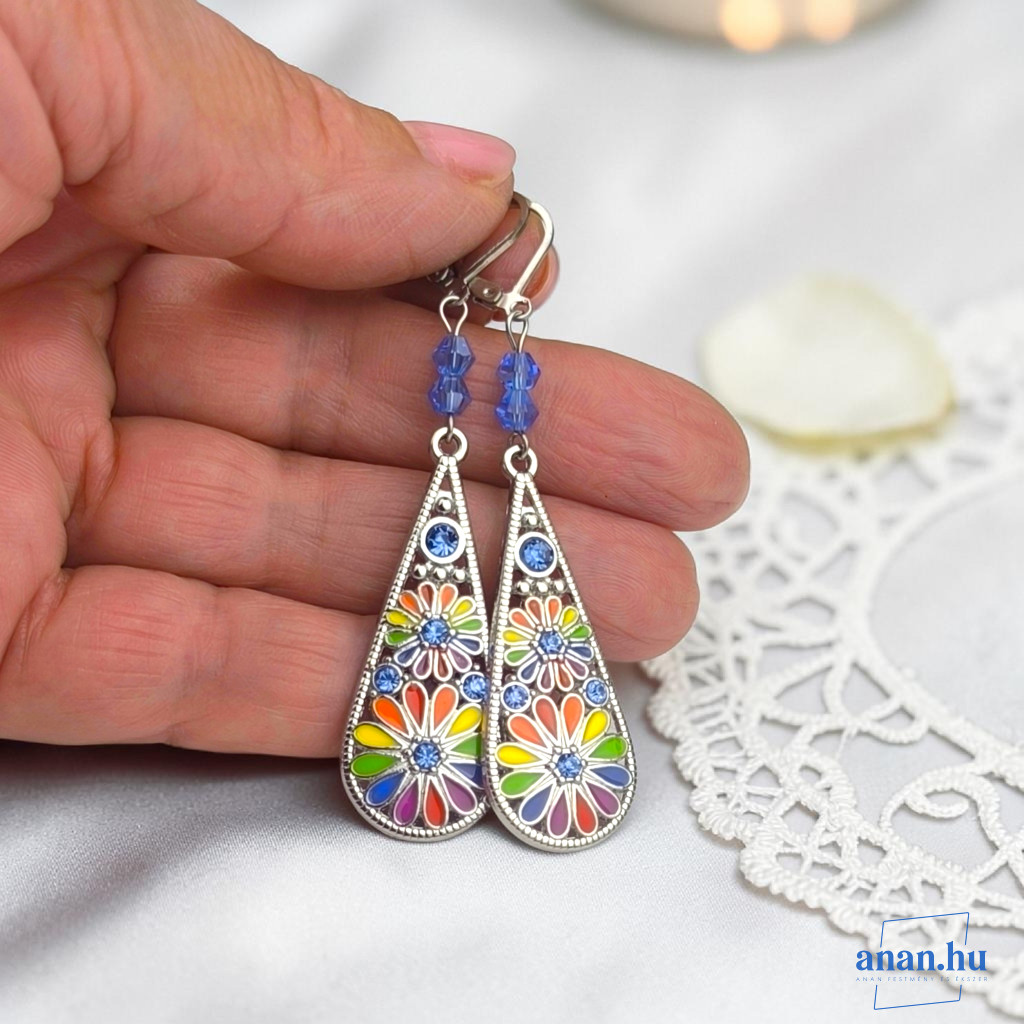 Cseppformájú cinkötvözet fülbevaló sok színű rekeszzománccal, kristály gyöngyökkel és csillogó strasszokkal. A francia kapocs és a fém szerelékek antiallergén nemesacélból készültek.