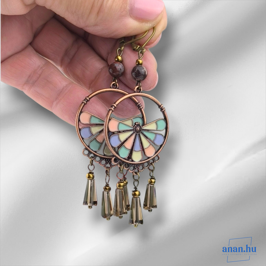 Pasztel színű rekeszzománccal díszített cink ötvözet fülbevaló, kristály cseppekkel, ásvány gyönggyel és bronz színű francia kapoccsal.