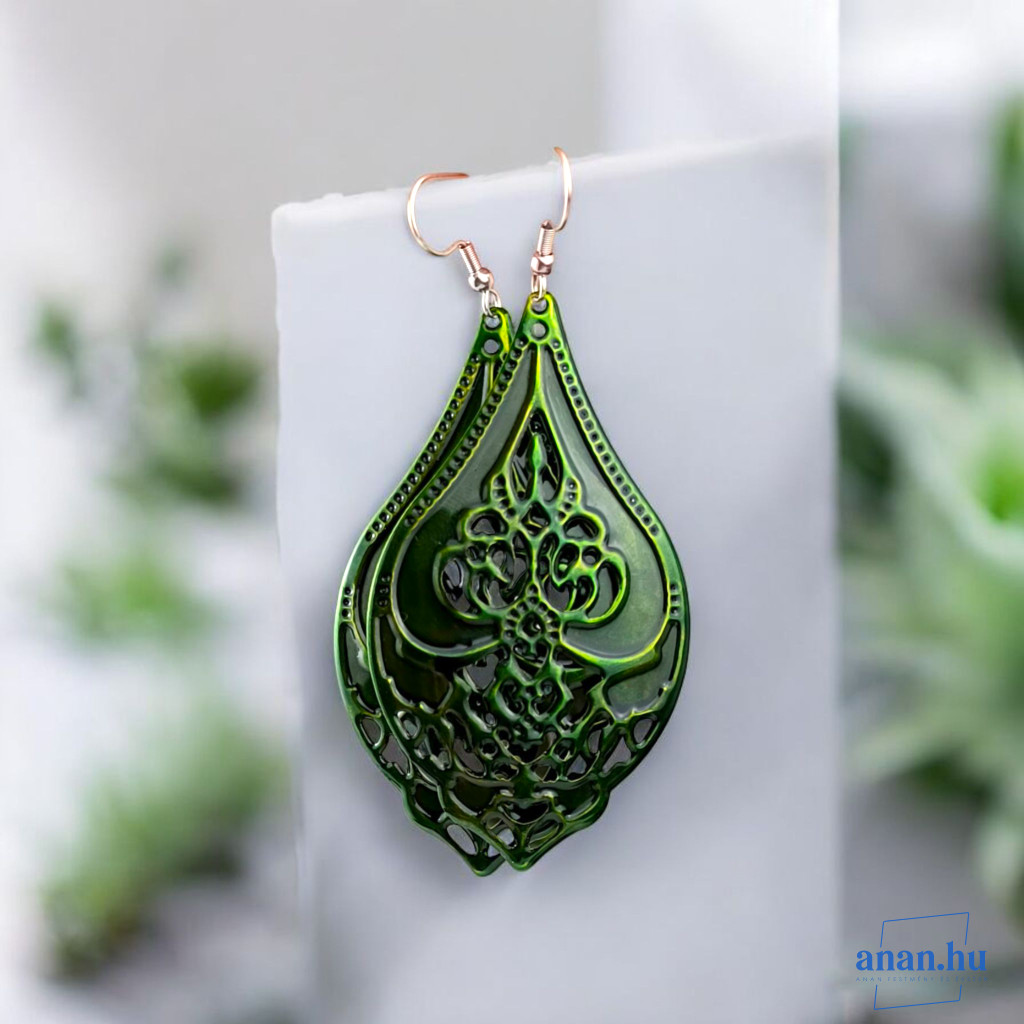 Gyönyörűen megmunkált csipkézett mintájú cink ötvözet fülbevaló, antiallergén nemesacél akasztóval, erdei zöld színű kézi festéssel.