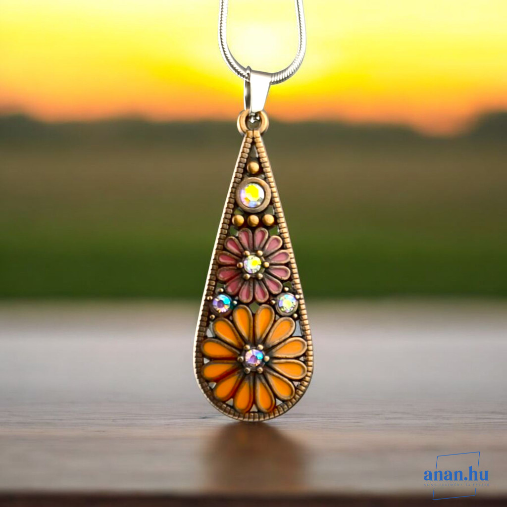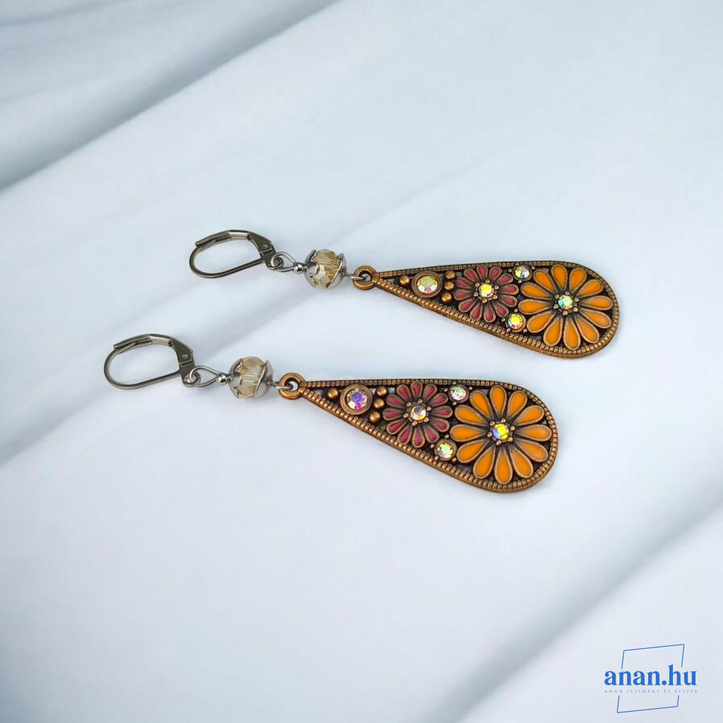 Cseppformájú cinkötvözet fülbevaló narancs-rózsaszín rekeszzománccal, kristály gyönggyel és csillogó strasszokkal. A francia kapocs és a fém szerelékek antiallergén nemsacélból készültek.
