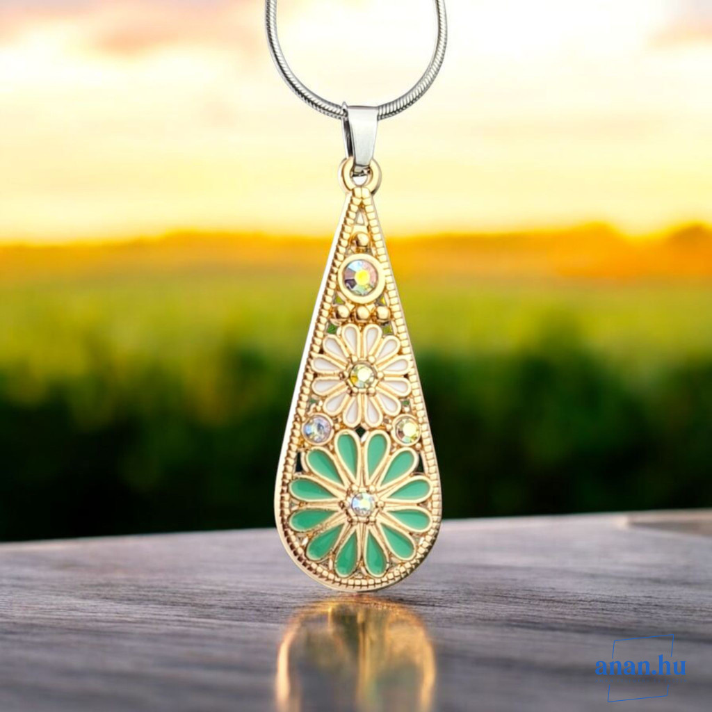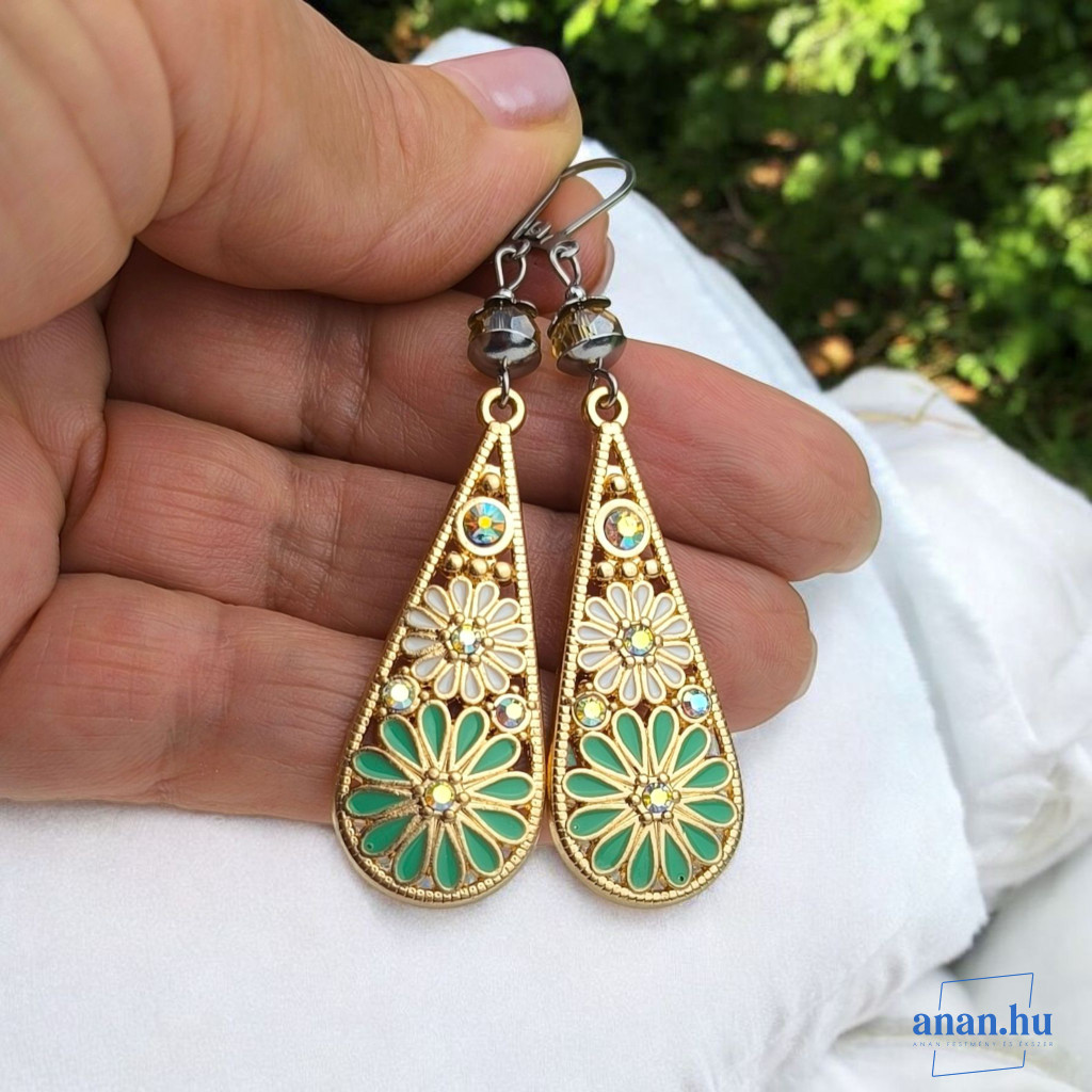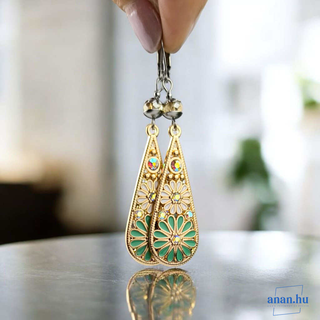 Cseppformájú cinkötvözet fülbevaló arany-zöld rekeszzománccal, kristály gyönggyel és csillogó strasszokkal. A francia kapocs és a fém szerelékek antiallergén nemsacélból készültek.