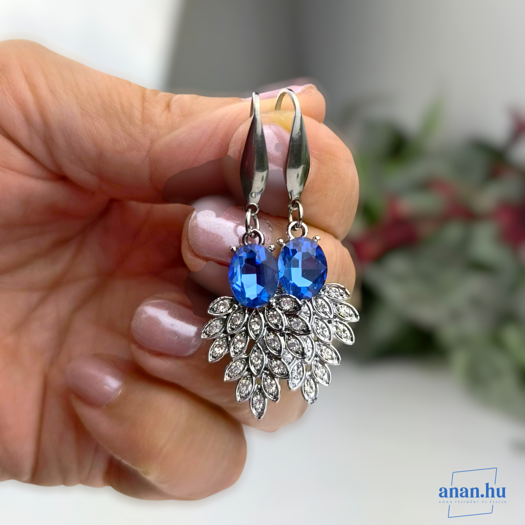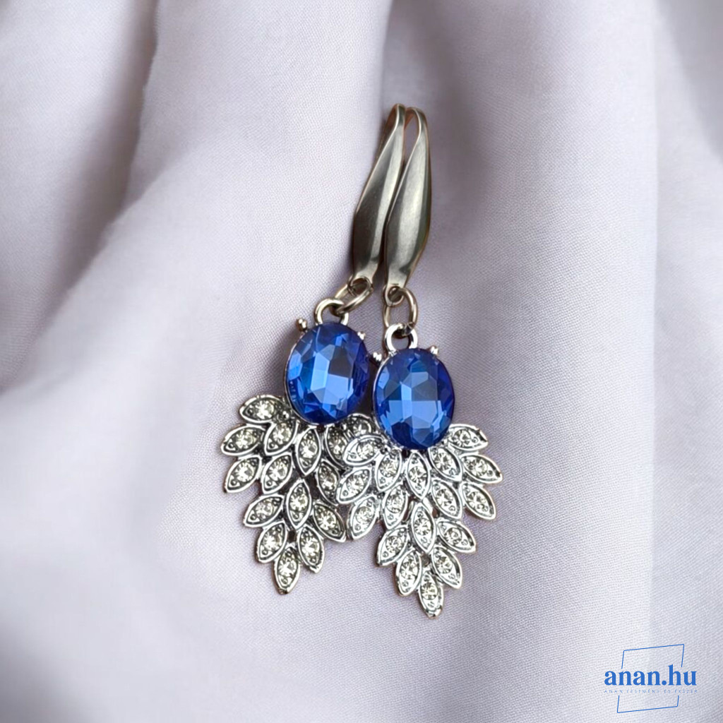 Csiszolt kék színű üvegkristállyal és strasszokkal díszített cink ötvözet fülbevaló antiallergén nemesacél fülbevaló akasztóval.
