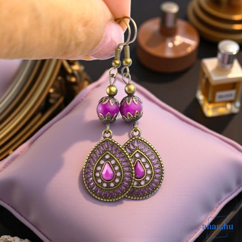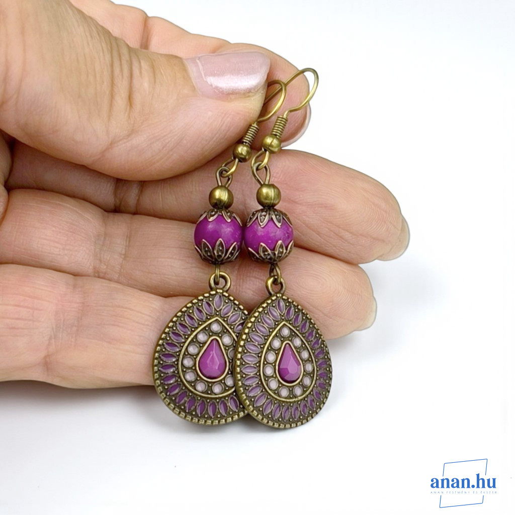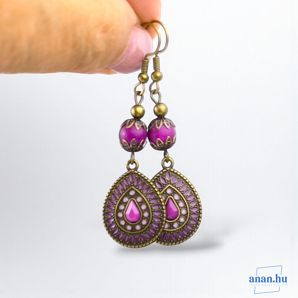 Bronzszínű, lila rekeszzománccal díszített fülbevaló, lila kőgyönggyel, bronzszínű szerelékekkel és akasztóval.
