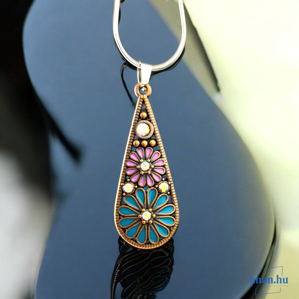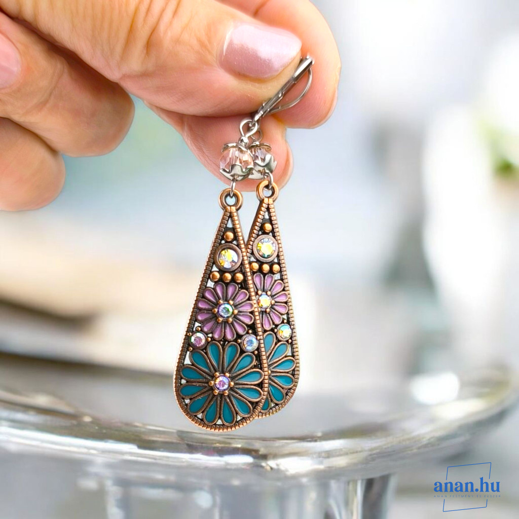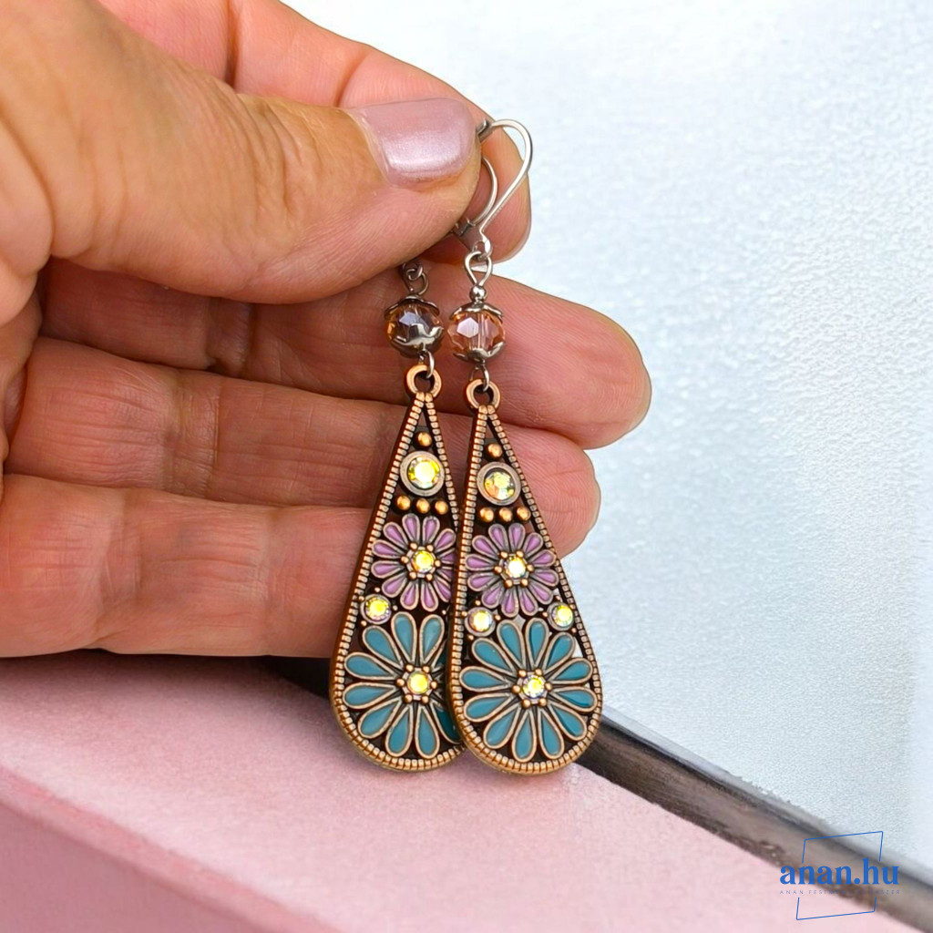 Cseppformájú cinkötvözet fülbevaló kék-lila rekeszzománccal, kristály gyönggyel és csillogó strasszokkal. A francia kapocs és a fém szerelékek antiallergén nemsacélból készültek.