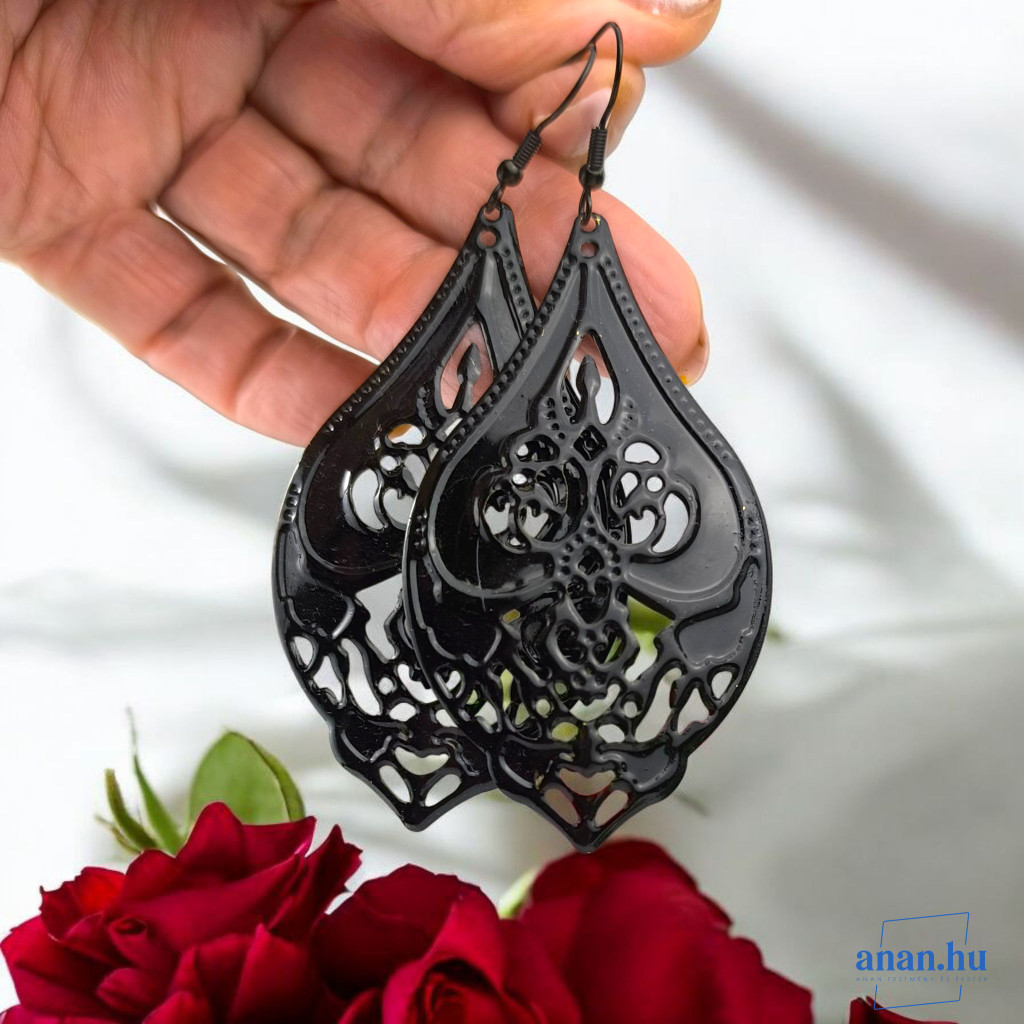 Gyönyörűen megmunkált csipkézett mintájú cink ötvözet fülbevaló, fekete színű antiallergén nemesacél akasztóval, fekete színű kézi festéssel.