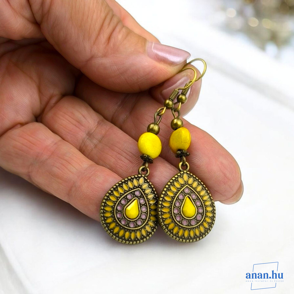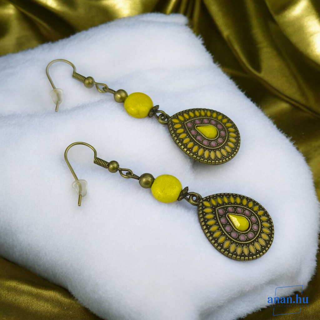 Bronzszínű, sárga rekeszzománccal díszített fülbevaló, sárga kőgyönggyel, bronzszínű szerelékekkel és akasztóval.