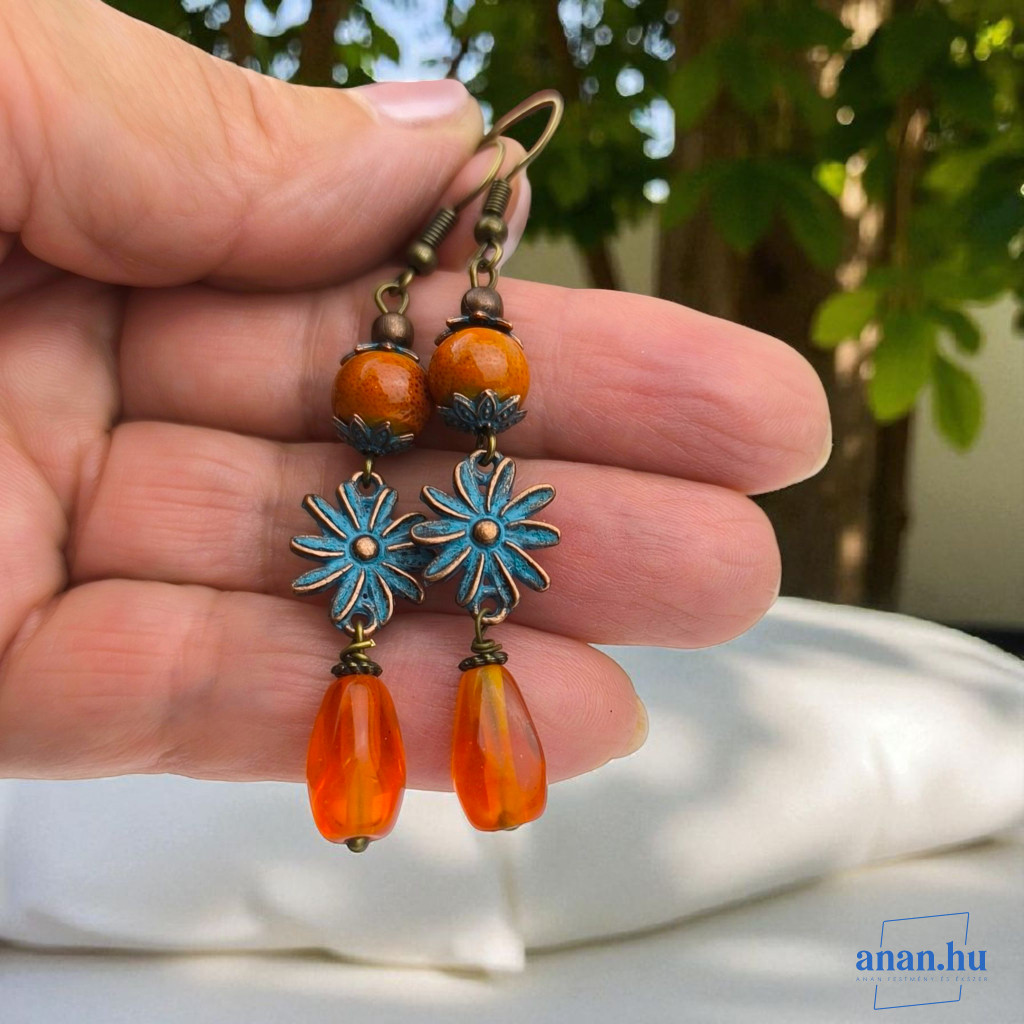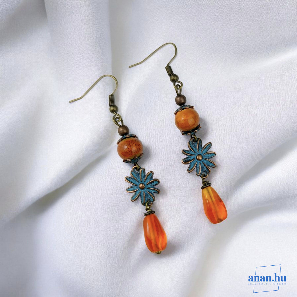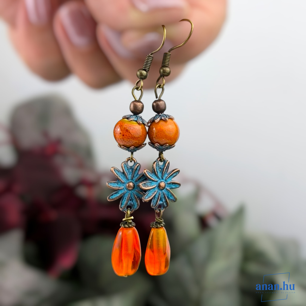 Hosszú fülbevaló narancsszínű kerámia gyönggyel, üvegcseppel, antikolt virágformájú csatlakozóval, bronzszínű szerelékekkel.