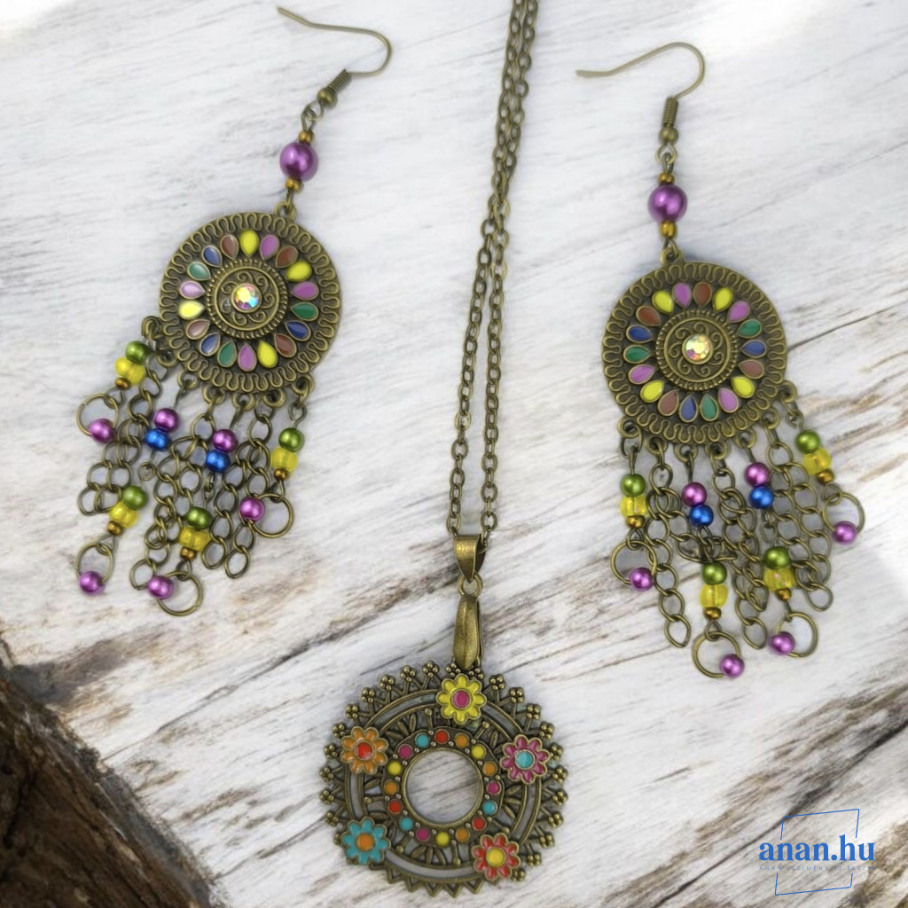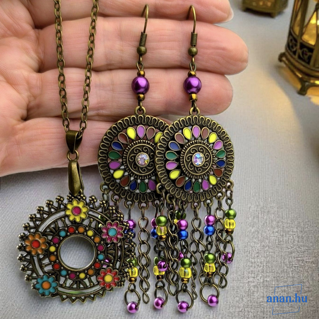 Keleti hangulatú, hangsúlyos fülbevaló hozzá illő medállal.