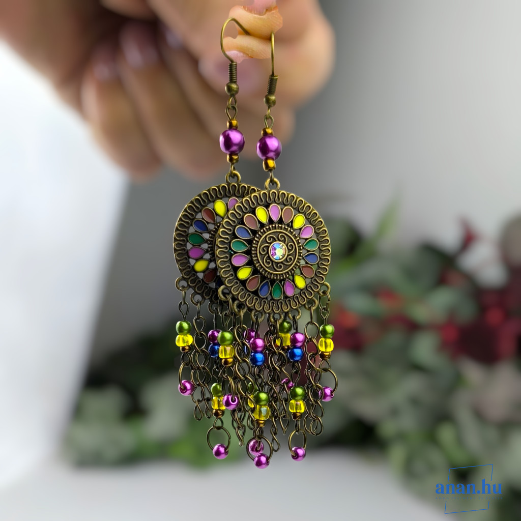 Színes rekeszzománc díszítésű, bronz cink ötvözetből készült hangsúlyos fülbevaló, színes gyöngyökkel, bronz színű francia akasztóval.